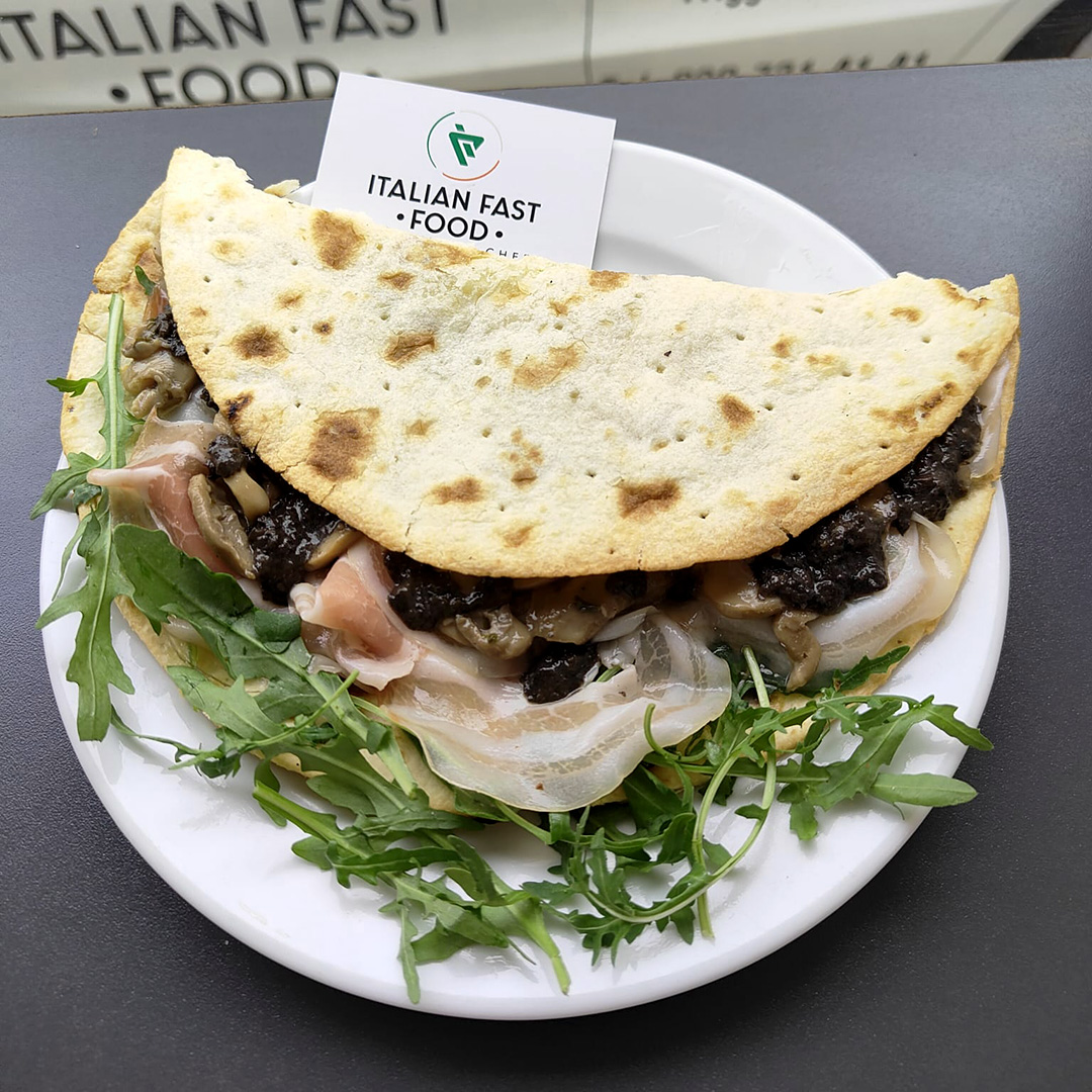 Mozzarella, fior di latte,pancetta, champignons poêlés, crème à la truffe, rucola