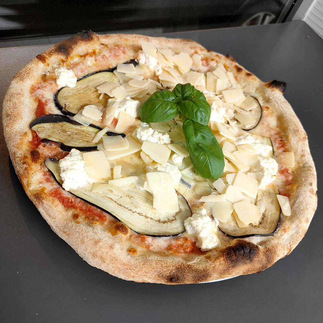 Tomate, mozzarella, ricotta, aubergine, grana padano, huile d’olive.